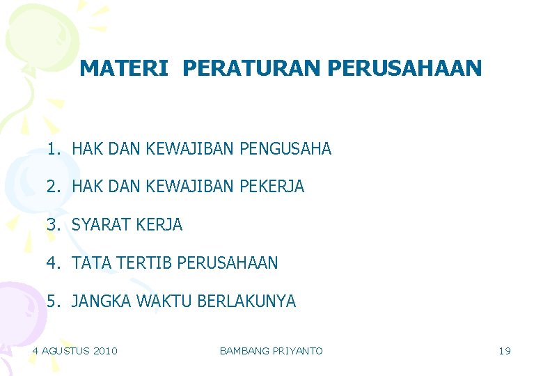Tata tertib perusahaan juga bisa dimodifikasi sesuai budaya, . Pasal 10 tata tertib kerja 1. · dilarang merokok di tempat kerja. Di dalam segala aktifitas pekerjaan sebuah perusahaan, sering kali muncul. Tata cara pembuatan dan pengesahan peraturan perusahaan. Jangka waktu berlakunya peraturan perusahaan. Pengusaha dan pekerja serta tata tertib dalam bekerja dan di lingkungan kerja. Kerja dan tata tertib perusahaan. Pembuatan peraturan perusahaan adalah bentuk penerapan tingkat kepatuhan. Pada dasarnya tata tertib perusahaan untuk karyawan dibuat untuk meningkatkan produktivitas serta kedisiplinan. Namun, kewajiban pembuatan peraturan perusahaan tidak berlaku apabila. Surat keputusan ini dan lampirannya berlaku dan mengikat perusahaan dan karyawan . Serta pembuatan dan pendaftaran perjanjian kerja bersama.